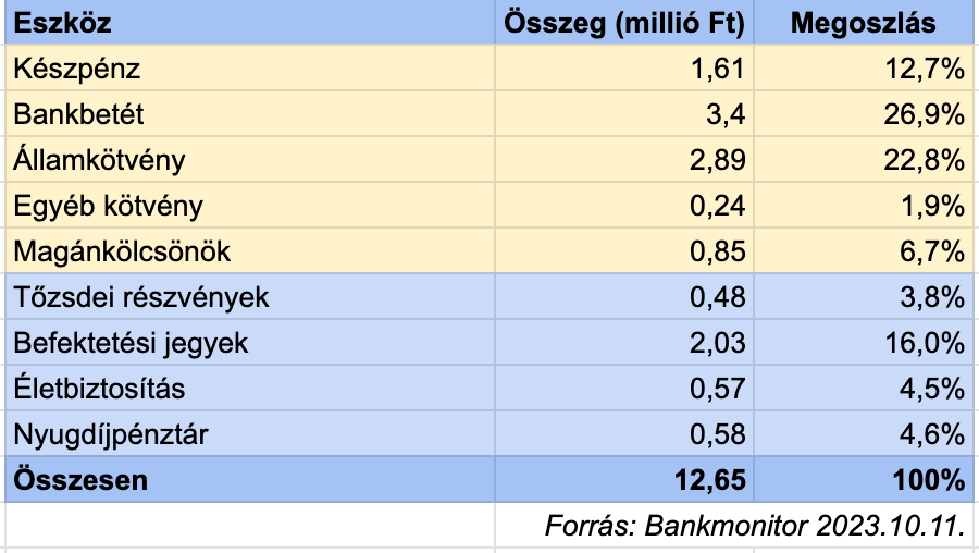 Az ábrából az is kiderül, hogy a megtakarítások jelentős része (~71%) ül olyan befektetési eszközökben, amik hosszútávon jóval alacsonyabb hozamot produkálnak (lenti ábrán sárgával kiemelve).