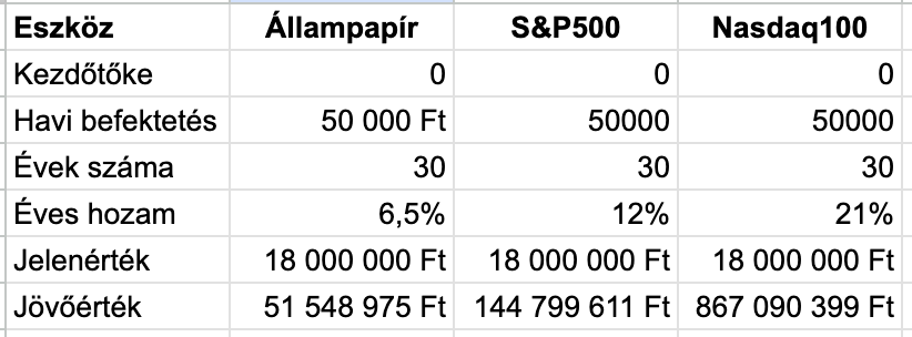 A fenti táblázatban látszik egy szcenárió, hogy mennyit számít, ha valaki állampapírban, vagy piaci alapokban fektet be havi rendszerességgel.