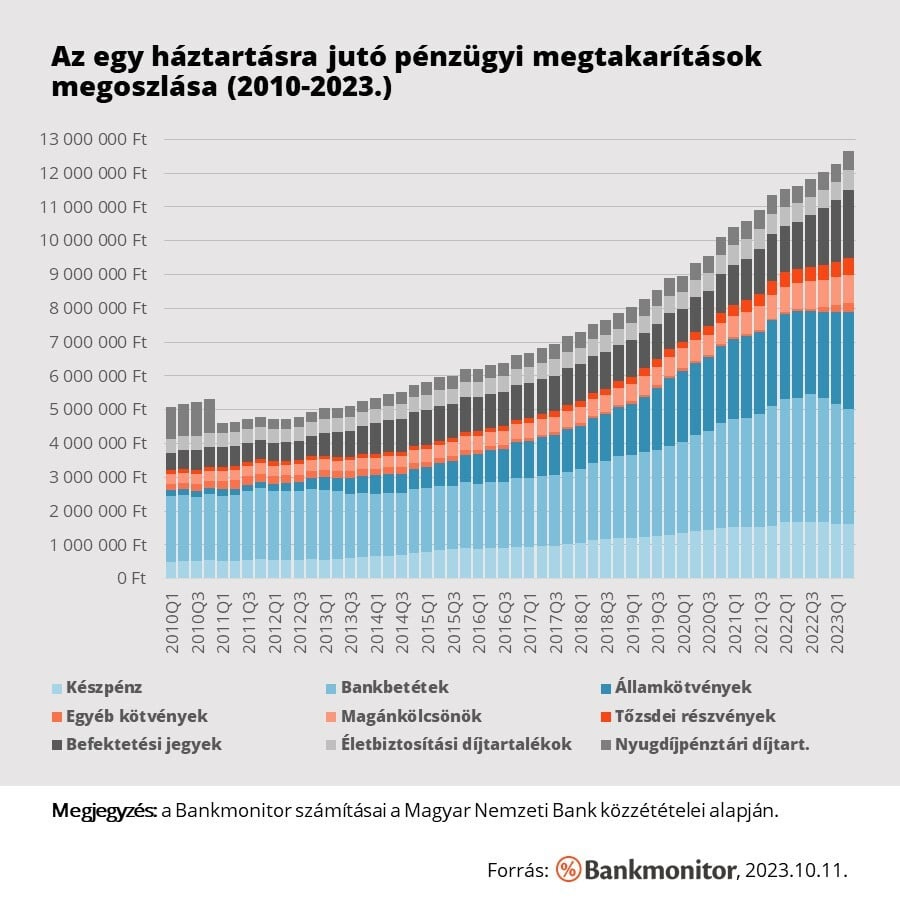 Magyarországon egy háztartásnak átlagosan 12 millió forint megtakarítása van. Ez pedig a lenti ábrán látszik, hogy hogyan oszlik meg.